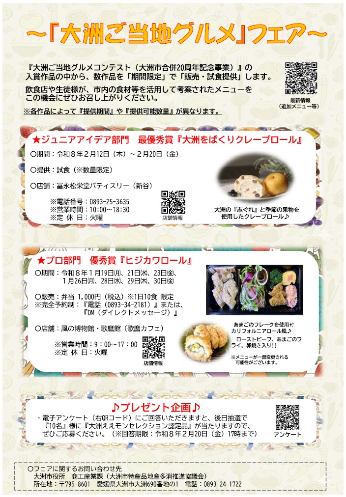 『大洲市合併20周年記念事業』で実施した「大洲ご当地グルメコンテスト入賞15作品」の一部作品を「期間限定」で提供するフェアを開催します。