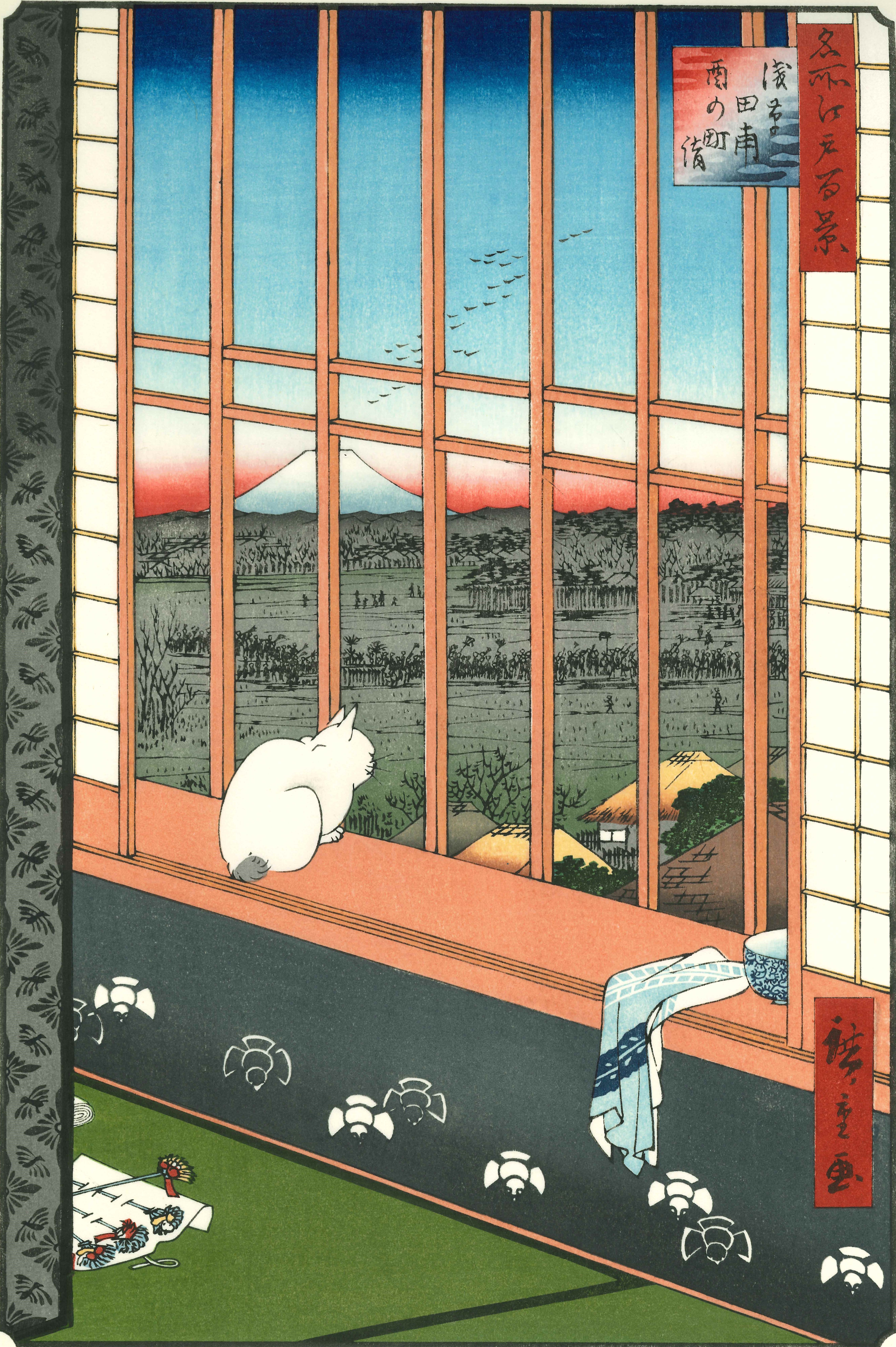 大きく描かれた手前の格子窓と、遠くの田んぼや富士山などの