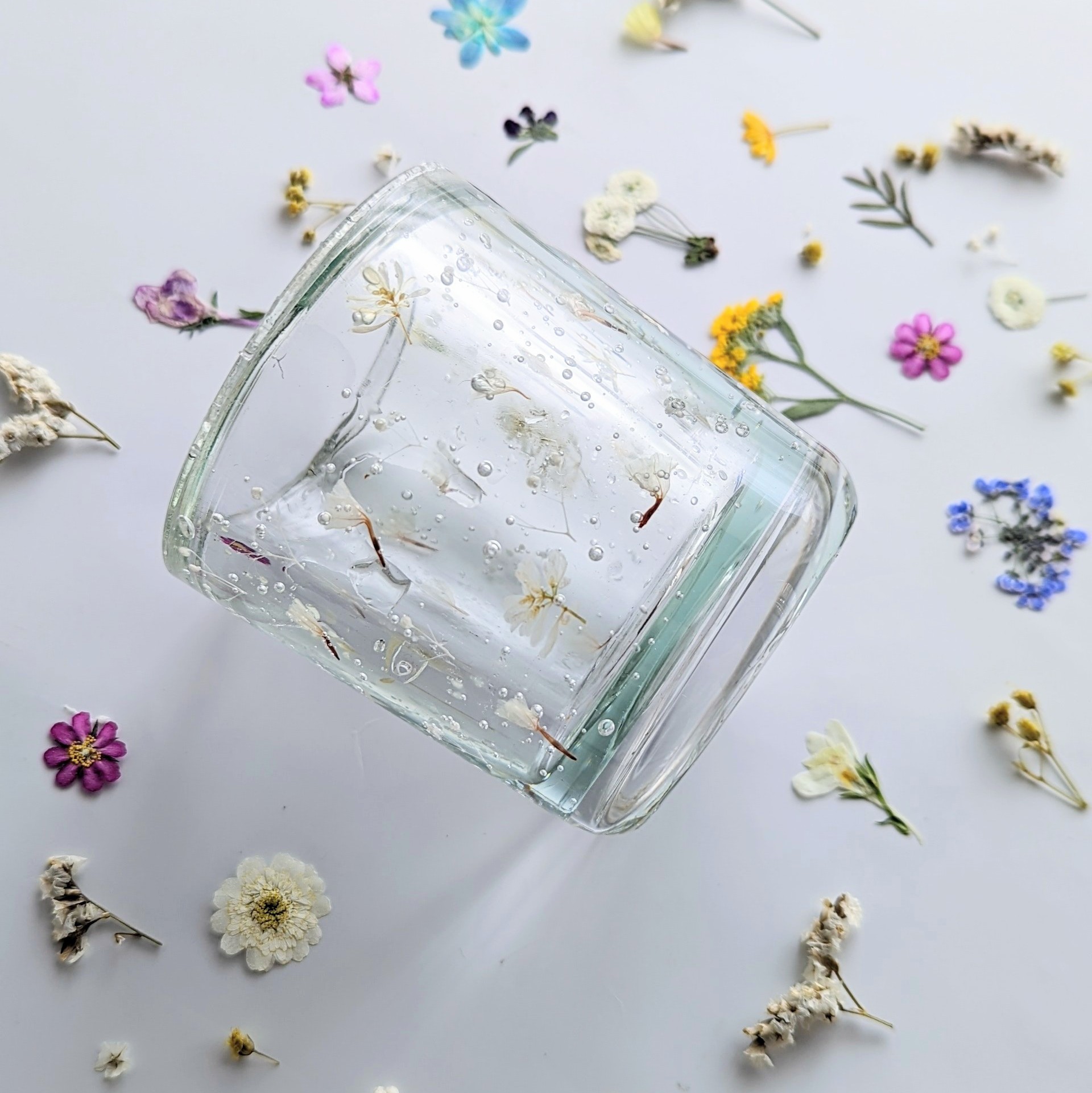 お好きな押し花を選んでもらい「ジェルランタンキャンドル」を作ります。